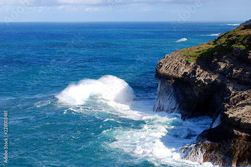 ocean, water, wave, pacific, island, shore, shoreline, rocky, cliff, splashing, crashing, large, big, horizon, kauai, hawaii, landscape, seascape, scenic, scenery, travel, kilauea, blue, sunny, turquoise, beautiful, rugged