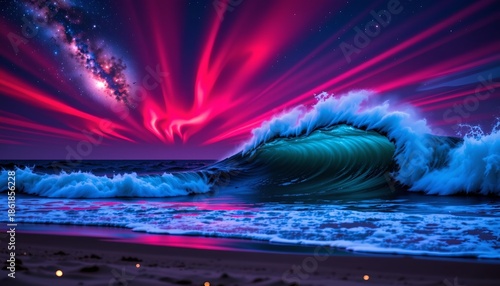 wave, breaker, surf, ocean, tide, mountain, swell, crest, curl, foam, spray, turbulence, power, energy, motion, dynamic, majestic, huge, expansive, scene, landscape, scenery, view, panorama, night, darkness, twilight, dusk, cosmos, galaxy, star, sky, celestial, universe, cosmic, wonder, glow, illumination, shimmer, sparkle, light, ambience, atmosphere, richness, high-coloured
