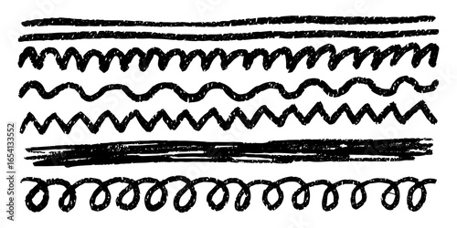Crayon black pencil underline. Kids crayon strips, brush line in sketch style, doodle lines set on white background
