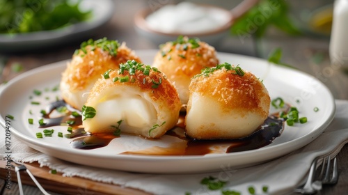 Cream croquettes are placed on a white plate. They look delicious and are used as advertising