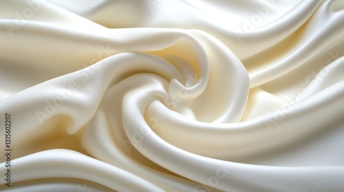 Cream-colored satin fabric folded in a luxurious spiral pattern, for fashion design promotion