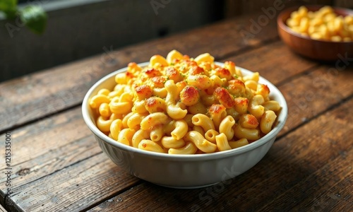 Creamy baked macaroni and cheese with a golden brown crust, served in a white bowl on a rustic wooden table, baked pasta, , comfort food