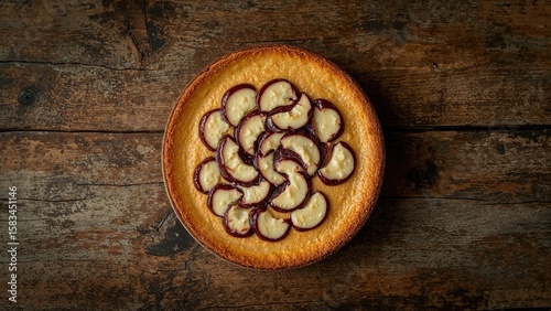 Creamy cake displayed on rustic wood surface