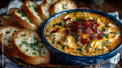 dip, chicken, bacon, cheese, bowl, bread, toast, parsley, wooden, rustic, food, snack, meal, garnish, creamy, cooking, cookery, kitchen, serving, dish, table, slice, texture, gold, crispy, savoury, delicious, homemade, receipe, culinary, fresh, ingredient, platter, arrangement, presentation, dining, eating, comfort, party, sharing, side, indulgent, warm, flavorful, herb, seasoning