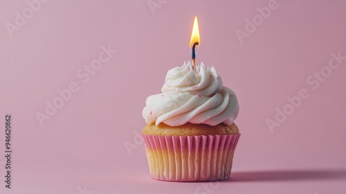 Creamy cupcake with a burning candle isolated on pink background with copy space. Sweet dessert for birthday party