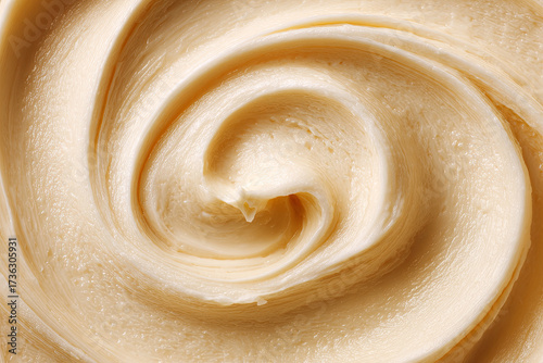 Creamy frosting forming a textured spiral, showcasing its smooth consistency and rich appearance, perfect for food preparation, confectionery, and gourmet themes