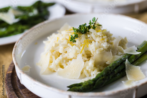 Creamy lemon risotto with parmesan and asparagus on white plate.