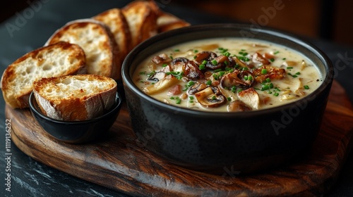 soup, mushroom, creamy, toasted, baguette, bread, food, dish, cookery, culinary, delicious, tasty, meal, dinner, lunch, receipe, cooking, kitchen, eatery, epicure, healthy, comfort, autumn, winter, plate, bowl, wooden, table, dark, background, texture, garnish, herb, chives, onion, savoury, rich, aroma, warmth, favor, hearty, satisfying, elegant