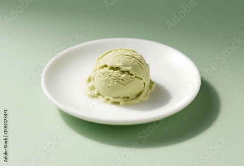 Creamy pistachio gelato on white porcelain dish with pastel green surface, soft top light for luxury dessert and premium melt detail