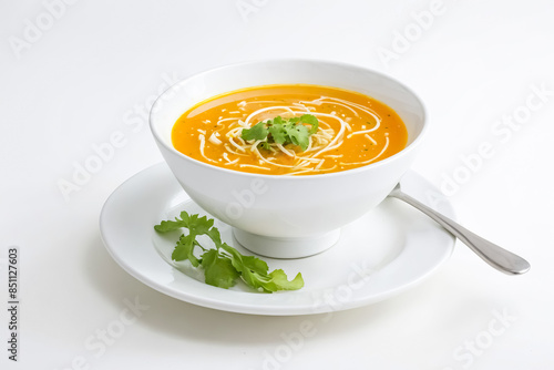 Creamy Pumpkin Soup in a White Bowl with Parsley Garnish