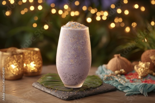 Creamy Purple Smoothie with Blue Sprinkles, Tropical Setting, Bokeh Background, Wooden Table, Palm Leaf, Teal Fabric, Gold Candles, Lush Ambience