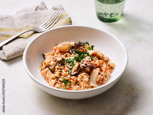 seafood, risotto, dish, dining, ingredient, fresh, cosy, herb, bowl, beverage, meal, favor, cookery, cooking, epicure, italian, creamy, garnish, receipe, eatery, chef, plate, presentation, culinary, delicious, food, texture, comfort, home cooking, enjoyment, quality, seasonal, appetising, dinner, nourishment, warmth, aesthetic