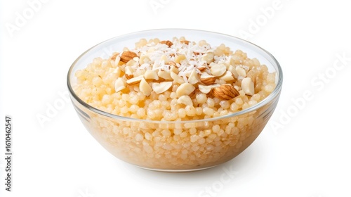 food, dessert, pudding, semolina, creamy, almond, coconut, sweet, delicious, healthy, breakfast, bowl, glasses, dish, meal, cookery, snack, tasty, eating, kitchen, cooking, receipe, ingredient, nourishment, dietary, organic, natural, grain, flake, white, background, isolated, studio, photo, image, picture, texture, closeup, top, view, plate, portion, garnish, culinary, treat, deliciously, delicacy