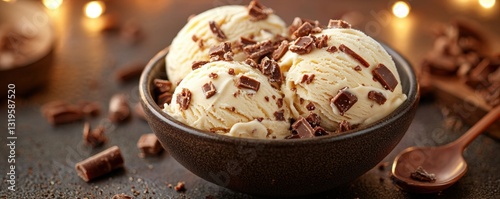 Creamy Vanilla Ice Cream with Chocolate Chunks in Rustic Bowl