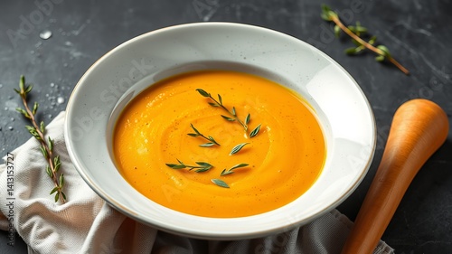 Creamy vibrant orange pumpkin soup in a white bowl garnished with fresh thyme sprigs ready to be served on dark background.