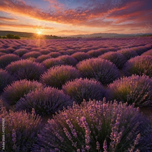 Create a breathtaking landscape scene featuring a vast lavender field in full bloom, stretching towards the horizon.