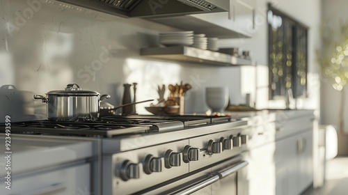 Create a clean and modern kitchen scene with a high-end stove equipped with a double oven, with a chef preparing a multi-course meal.