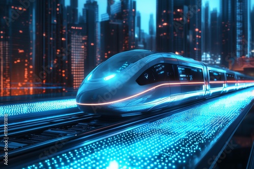 Create a futuristic scene featuring a sleek, modern high-speed train aligned on a digital platform with glowing blue LED lights