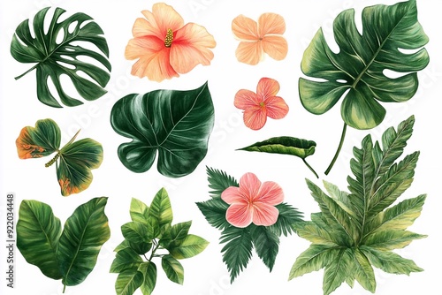 Create a vibrant and lush set of tropical leaves and flowers. Include a variety of leaves such as large monstera, palm fronds, and ferns, along with exotic flowers like orchids, hibiscus, and plumeria