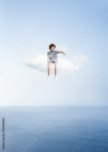 Creative collage with little preschool boy sitting on white cloud and flying at sky, outdoors. Concept of childhood, happiness, dreams, adventure