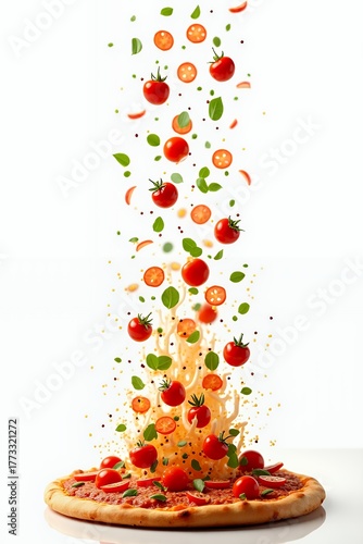 Creative Food Concept of Fresh Ingredients Falling onto Pizza.