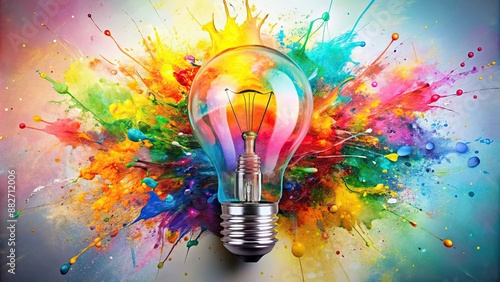 Creative light bulb surrounded by various colorful paint splatters, innovation, creativity, ideas, art