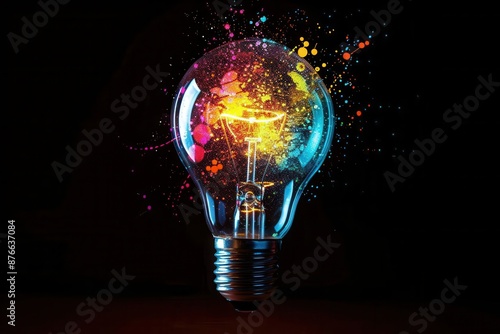 Creative light bulb with vibrant, colorful splashes on black background, symbolizing innovation, ideas, and inspiration in a dynamic visual.
