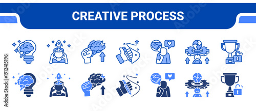 Creative Process Icon Collection, featuring Creativity, Imagination, Brainstorming, Writing, Thinking, Cognitive, Achievement.