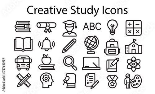 education, creative, study, e-learning, icon, set, vector, line, outline, school, university, college, cognition, diploma, certificate, graduation, cap, student, rudiments, alphabet, idea, light bulb, calculating machine, open book, bell, crayons, globe, earth, backpack, bus, apple, magnifying glass, search, blackboard, writing, atom, science, mathematic, ruler, gear, brain, mind, notebook, test, exam, medal, award