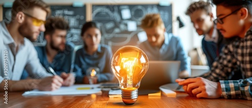 Creative team brainstorming in office with glowing lightbulb, symbolizing innovation and teamwork.