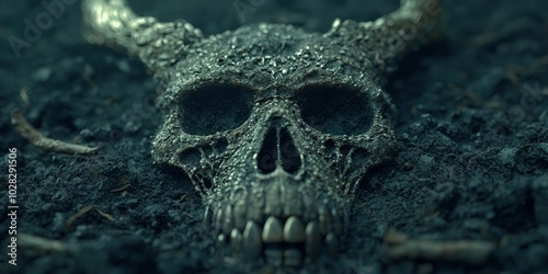 Creepy Skull with Horns in Dark Soil Halloween Horror Fantasy Dark Art