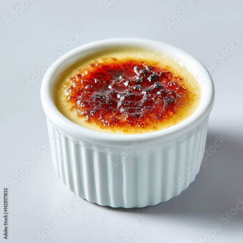 Creme brulee with caramelized sugar crust, vanilla specks, white fine china