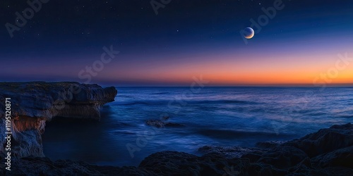 crescent, moon, venus, glow, softly, dusky, sky, calm, sea, wave, rocky, shoreline, gradient, deep, blue, orange, hue, twilight, evening, celestial, nature, landscape, calmness, beauty, astronomy, atmospheric, serene, peaceful, horizon, dusk, coastal, scene, scenery, night, colours, water, coast, dreamlike, overhead, stillness, radiance, illumination, vista, skyward, silhouette, ocean