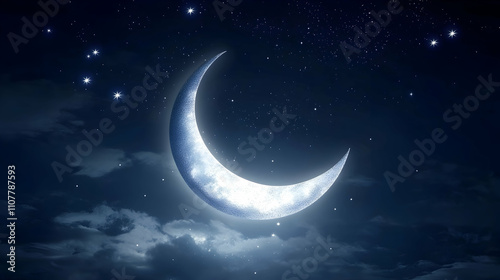 Crescent moon glowing brightly in a dark night sky filled with stars and clouds.