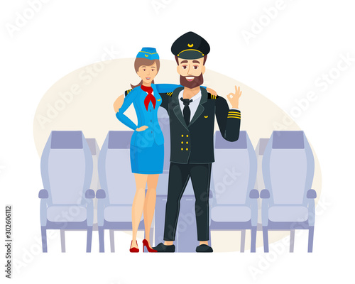 Crew airplane plane captain and stewardess in uniform standing together inside an airplane cartoon vector illustration.