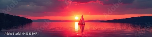 orange, navigation, crimson, serene, sailboat, horizon, view, vessel, landscape, colours, watercraft, image, cloud, beautiful, nature, peaceful, red, evening, twilight, photo, adventure, ocean, boat, scene, golden hour, calm, sail, water, ship, picture, lake, sky, sunset
