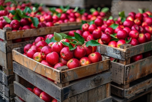 Crisp red apples stacked in rustic wooden crates, showcasing abundant fresh produce at a local market