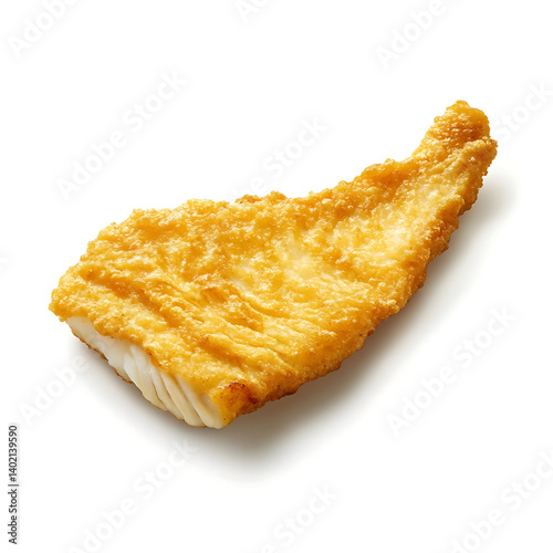 Crispy and golden fish fillet with a light, flaky interior, isolated white background