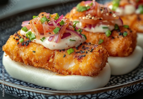 Crispy fried fish fillet on fluffy bao bun topped with tangy vegetables and creamy sauce, beautifully plated for an appetizing presentation in a restaurant setting