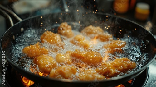 crispy golden chicken drumstick being fried in a traditional Thai pan. The oil is bubbling and foaming, exuding a mouth-watering fragrance that fills the air. golden and perfectly crispy