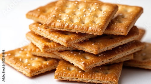 Crispy golden wheat crackers neatly stacked on a clean white background ideal for snacks and culinary presentations