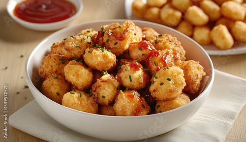 Crispy, golden-brown, bite-sized balls, tossed in sauce, garnished with herbs