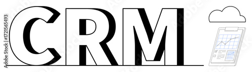 CRM typography integrated with cloud symbol and clipboard featuring a data chart. Ideal for customer management, cloud solutions, analytics, organization, productivity, optimization, simple flat