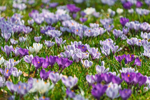 white, outdoors, fresh, bulb, plant, open, green, spring, carpet, ground, grass, morning, growth, purple, violet, vibrant, bloom, delicate, garden, meadow, field, lawn, flora, striped, growing, flocked, flower, nature, landscape, blooming, bee, pollination, texture, sprouting, botanical, flowering, seasonal, sunlit, crocus