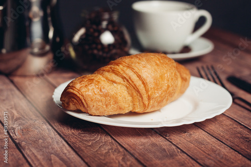 croissants saucer on the table fork with a knife fresh pastries