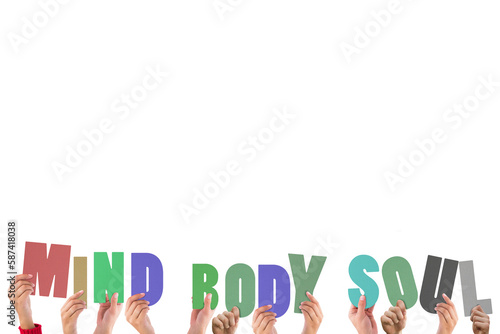 Cropped hands holding colorful words mind body soul