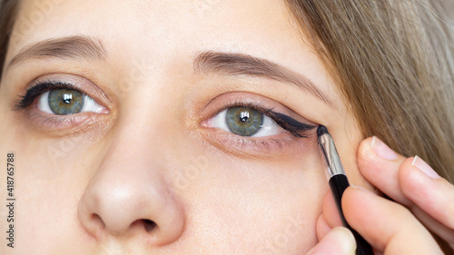 Cropped shot of a young beautiful woman using a contour brush while drawing arrows on the eyelids. A girl makes a makeup herself at home