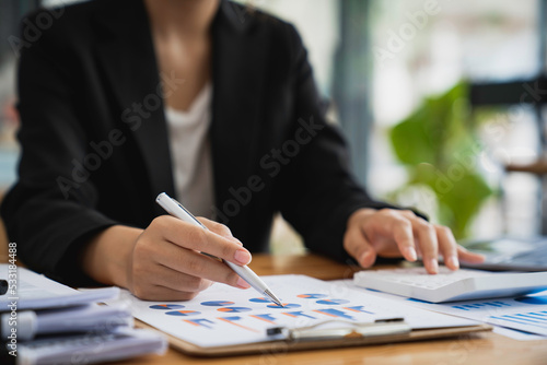 cropped shot view of a bookkeeper or financial inspector hands making a report, calculating or checking balance. Home finances, investment, economy concept