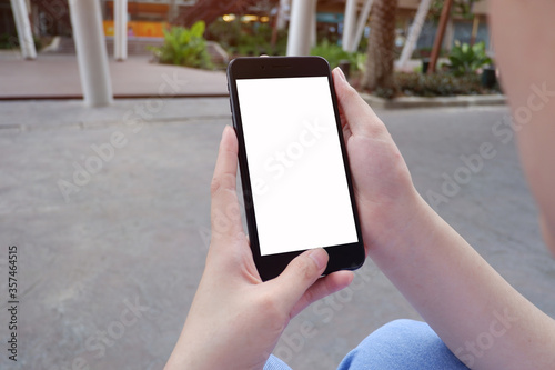 Cropped shot view of business woman’s hands holding the mobile phone with blank copy space screen for your information content or text message.