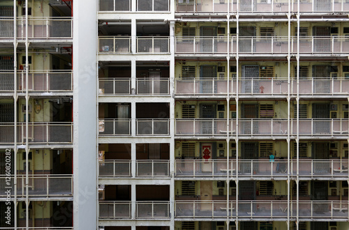 Crowded narrow flats of a building in an old public housing community in Kennedy Town, Hong Kong, a phenomenon of high housing density and severe housing shortage due to overpopulation in HongKong